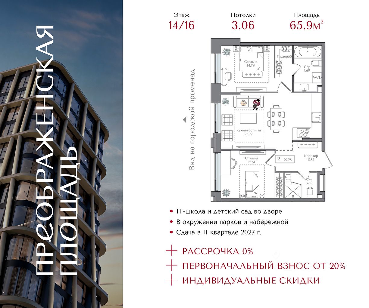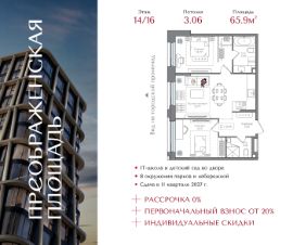 Квартира на 14 этаже в жилом комплексе премиум-класса "Преображенская площадь". Общая площадь: 65.9 кв.м.