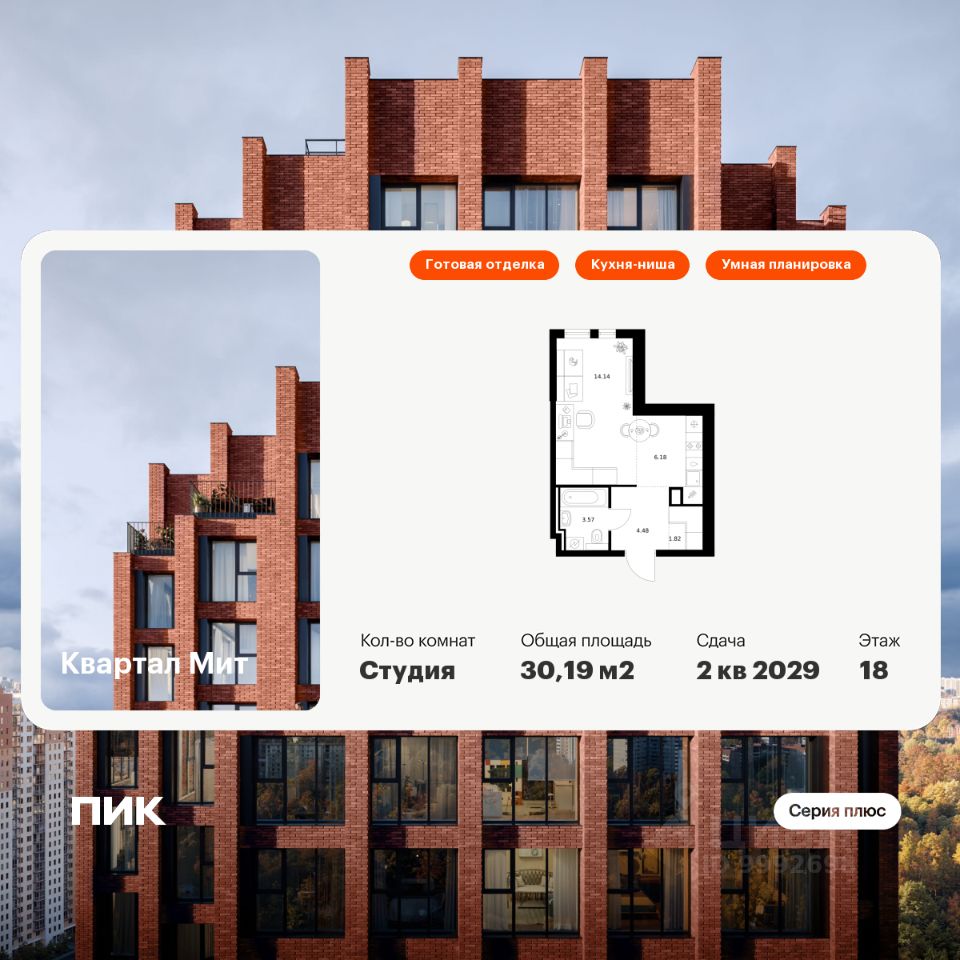 Новостройка! Продается 1-комн. кв-ра площадью 30,19 кв.м, (Корпус 3.4, Секция 4) 13 этаж 32-этажного дома в Квартал Мит от ПИК. "Квартал Мит" строится в экологически чистом районе Митино, где по соседству расположен большой лесопарк, а с двух сторон протекают реки Сходня и Журавка. Для семей с детьми здесь появится школа и два детских сада.