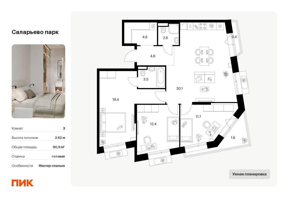 Продаётся 3-комн. квартира площадью 90,9 кв.м на 12 этаже 22 этажного дома (Корпус 73, Секция 1) проекта ПИК Саларьево парк. Светлый просторный подъезд на уровне земли, функциональная планировка, большие окна, c отделкой.