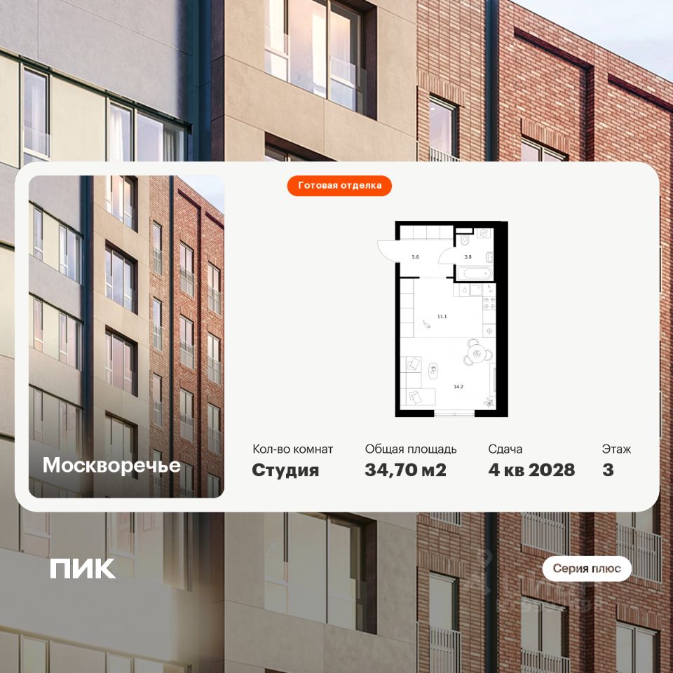 Продаётся квартира-студия площадью 34,7 кв.м на 4 этаже 29 этажного дома (Корпус 2.1, Секция 1) проекта ПИК Москворечье. Светлый просторный подъезд на уровне земли, функциональная планировка, большие окна, c отделкой.