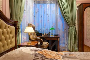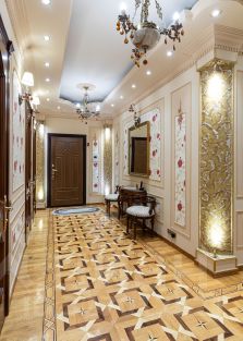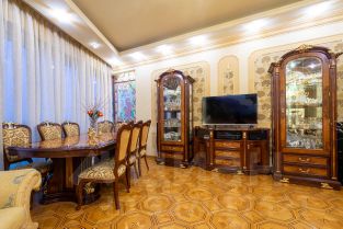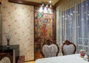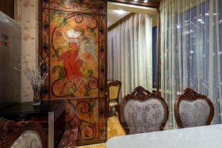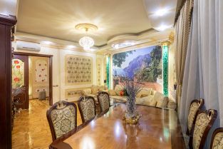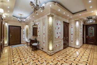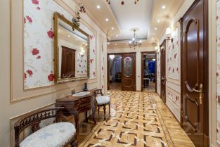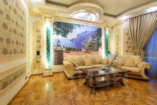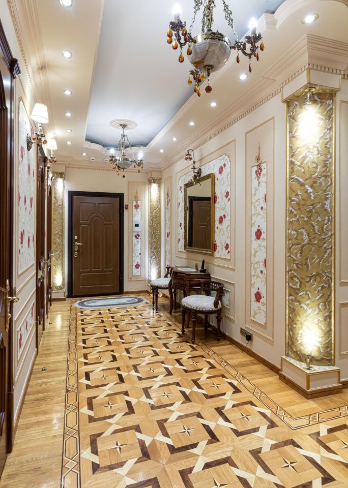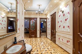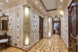 Ремонт-класса люкс поражает изысканной роскошью отделки - лепка карнизов, висячие потолки, арки, обои тканевые заключенные в двойные рамки из материала бук с инкрустацией с угловыми элементами, бордюрами и молдингами- колоны под мрамор зеленого цвета с беловатыми жилками с золотыми лотосами , в том числе в прихожей, художественный паркет мозайка из ценных пород дерева ( дуб, красное дерево- Мербау, орех, клен, груша) от 240 347 узорных элементов на 1 м2 с разными узорами в разных комнатах, включая кухню и прихожую, в стиле Леонардо да Винчи и зимний дворец Георгиевского зала. Два сан/узла большой и гостевой, элитные дорогие керамические плитки с тремя рядами бордюров, с подогревом пола произ-во Канада, автоматическая вентиляция, все трубы REHAU, смесители, полотенцесушители, угольники золото 24 карат фирмы Migliore -Италия, аксессуары так же из золото 24 карат .