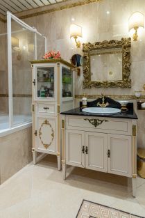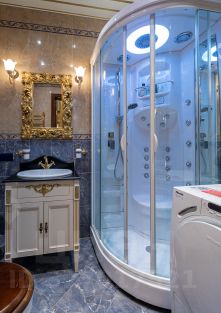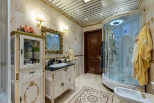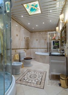 Сантехника - цельная керамика произ-во Италия Cezares King Palace , сиденье унитаза из цельного ореха , душевая кабина с оздоровительным массажем производство Финляндия, мебель в ванной - имеет мраморную столешницу с золотыми ручками производство Италии. Система Аква-стоп автоматическое выключение воды, в случае утечки. Кондиционеры "Mitsubishi". Кухня- итальянская мебель, массив ореха. Техника Bosch. Стиральная и сушильная машина Miele. Люстры - бронза знаменитой фирмы Бохорама- Испания.