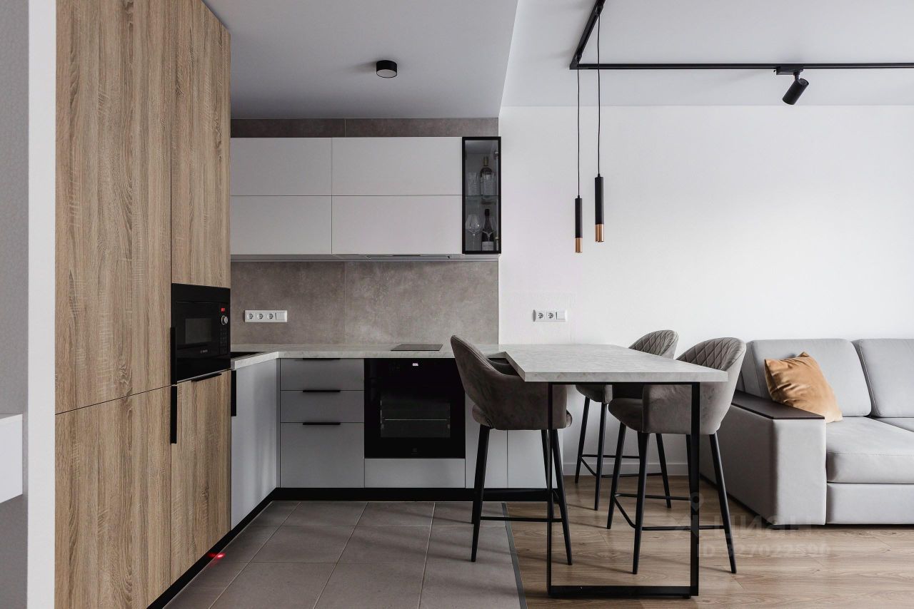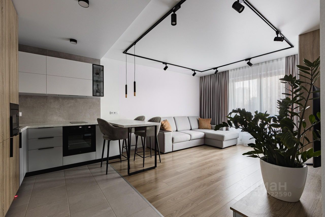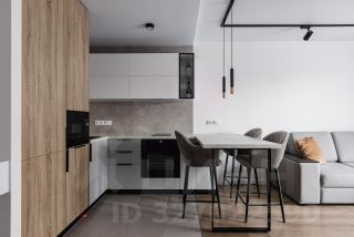 - Заменены натяжные потолки в кухне гостинной на глубоко матовый, установлена трековая система со спотами