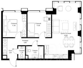 2 спальные комнаты: 14.7-11.4-11.4 м²