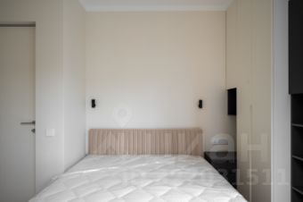 Приватная спальня расположена за дверью скрытого монтаж. Встроенные шкафы наполнены функциональными элементами для хранения.
