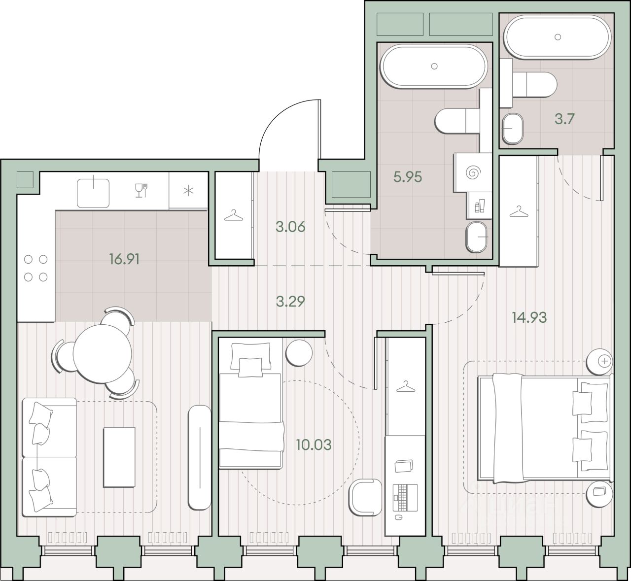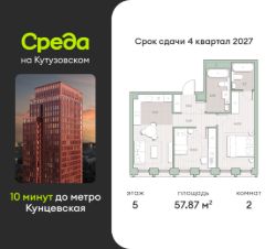 Продаётся 2-комнатная квартира общей площадью 57.87 кв.м. с отделкой white box. Квартира расположена на 5 этаже корпуса 4.1 в жилом комплексе бизнес-класса "Среда на Кутузовском" в пешей доступности от метро "Кунцевская".