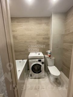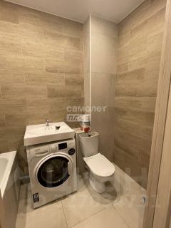 Просторный современный совмещенный санузел вмещает в себя большую ванну,стиральную машину. Плитка до потолка.