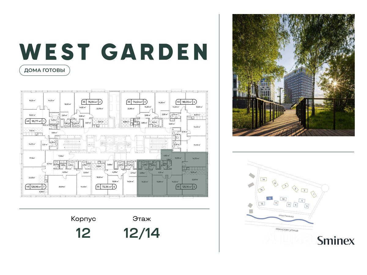 West Garden - это собрание клубных домов высотой 12-14 этажей в собственном парке 16 гектаров вдоль реки. Просторный среднеэтажный квартал расположен на Минской улице, в респектабельном Западном округе столицы. Вокруг премиальное окружение и более 1000 гектаров парков.