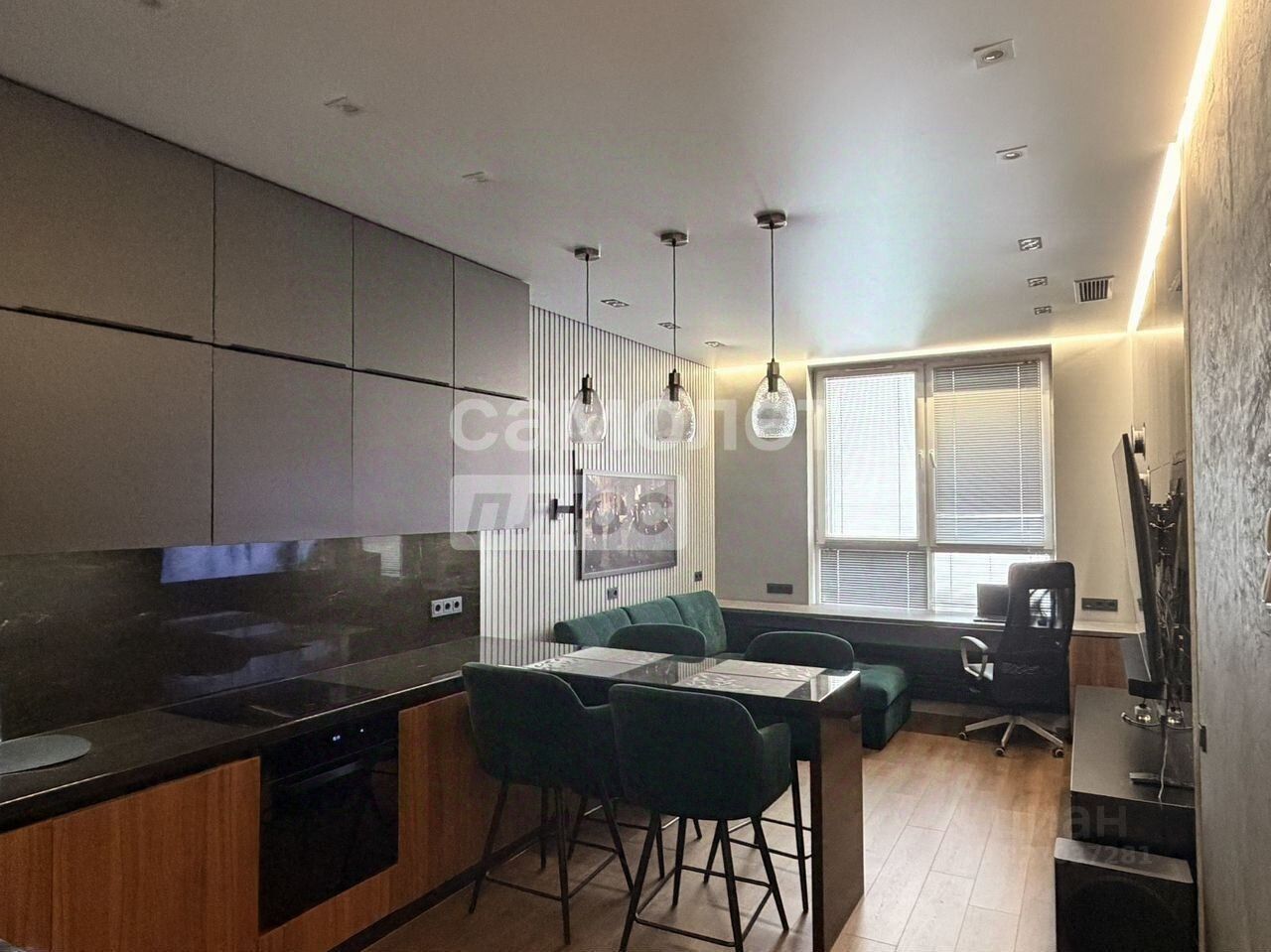Премиальный интерьер: Благородные оттенки, цельный и дорогой вид, панорамные окна наполняют пространство светом и открывают красивые виды на город и закаты.