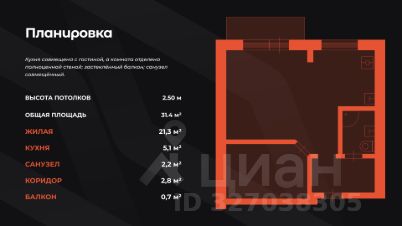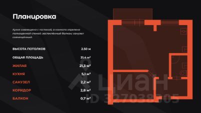 Кухня совмещена с гостиной, а комната отделена полноценной стеной; застеклённый балкон; санузел совмещённый.