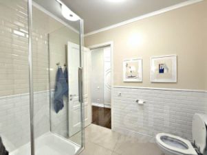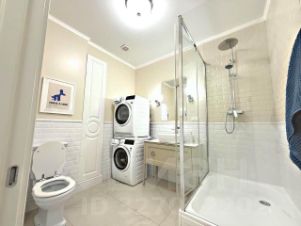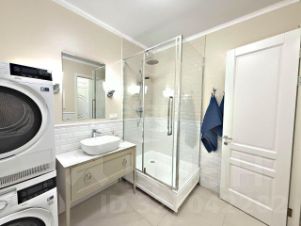 Санузел совмещённый: душ с тропическим лейком, пенал, тумба с раковиной, стеклянная перегородка.