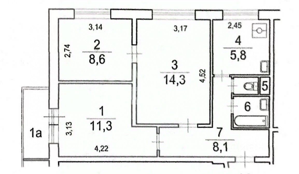 Санузел раздельный, что очень удобно, а под раковиной компактно размещена стиральная машина, экономя пространство.