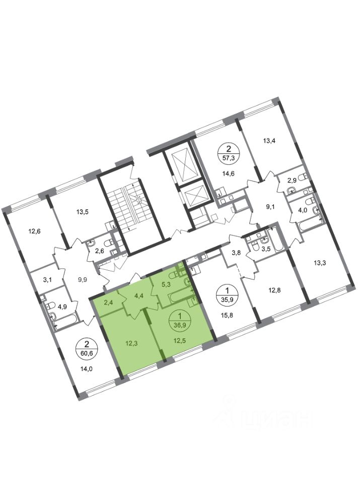 Общая площадь квартиры - 36,9 кв. м, этаж 2 из 17.