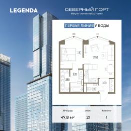 Просторная однокомнатная квартира с предчистовой отделкой в ЖК "Северный Порт" на 21 этаже. Общая площадь: 47.8 кв.м., жилая: 11.5 кв.м., площадь просторной кухни-столовой: 21.5 кв.м. Все окна выходят на одну сторону. В квартире один совмещенный и один раздельный санузел. Высота потолков 3.15 м.