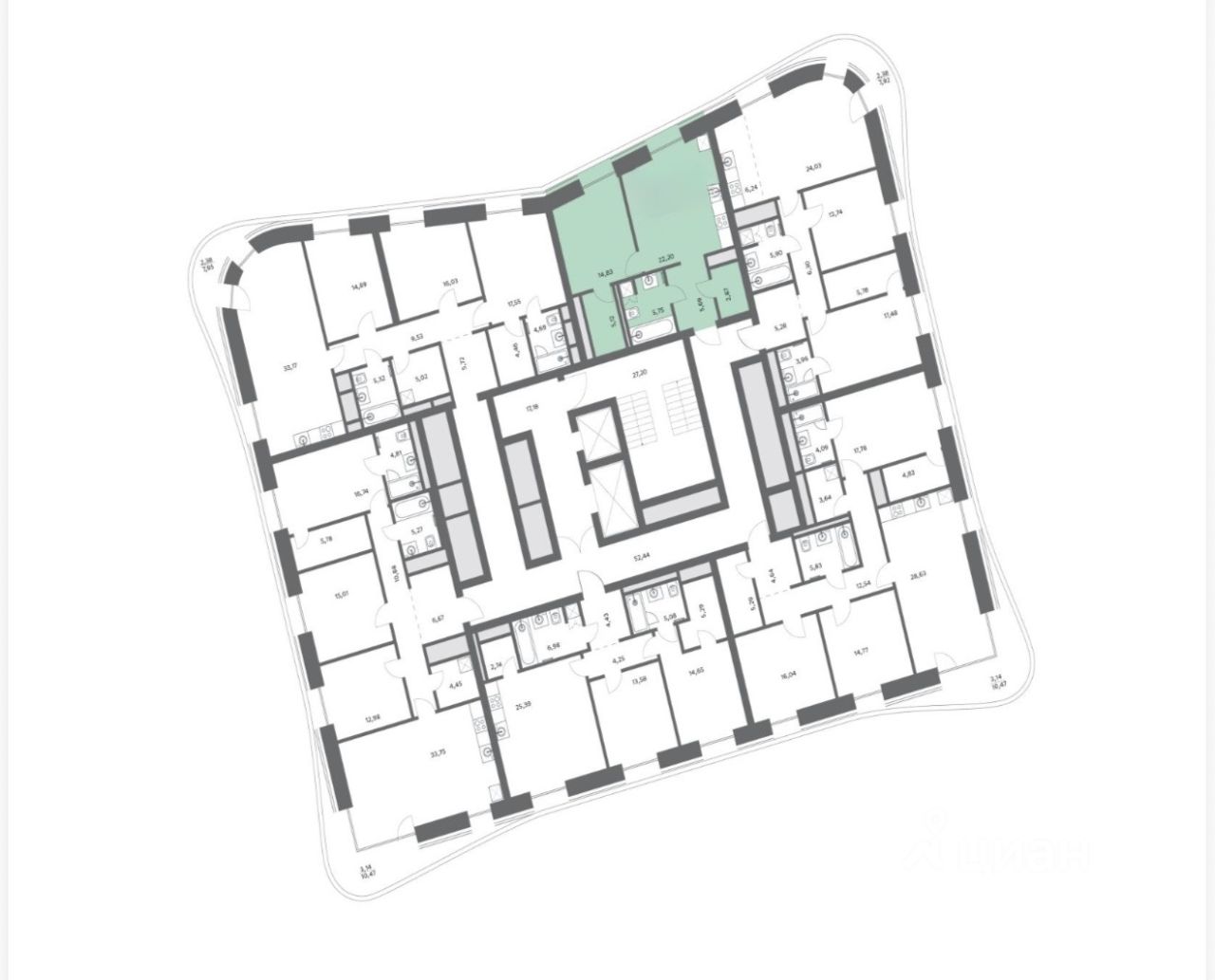 Планировка: кухня-гостиная 22,2 кв.м., жилая комната 15,83 кв.м., прихожая 5,69 кв.м., санузел 5,75 кв.м., гардеробная 5,12 кв.м., кладовая 2,87 кв.м.