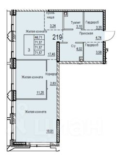 3-комн. кв., 71.57м², 13й этаж, 1я очередь в ЦАО, Замоскворечье.