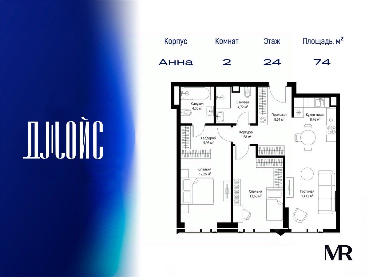 В продаже квартира площадью 74.04 м² с предчистовой отделкой на 24 этаже 55 этажного дома. Квартира расположена в корпусе Анна.