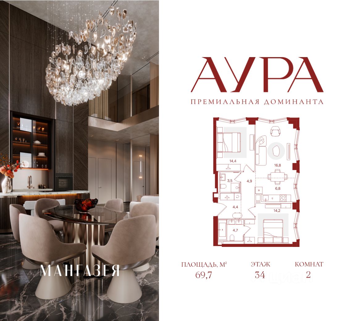 2-комнатная квартира площадью 69,7 м2.