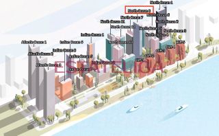 Бюро Kleinewelt Architekten задумали квартал как пространство визуальных метаморфоз. Солидные, ростом до 49 этажей здания прочерчены вертикальными разрезами и все вместе создают облик города современных супертонких небоскребов. Архитектурный диалог City Bay в квартале North подхватывают узкая стеклянная башня — шириной всего 9 метров и башня обтекаемой формы.