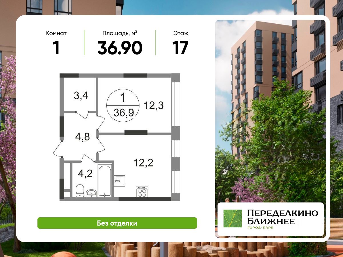 Продается однокомнатная квартира без отделки в городе-парке "Переделкино Ближнее".