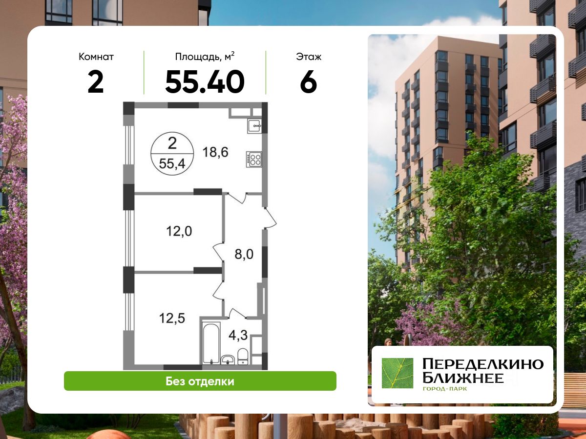 Продается двухкомнатная квартира без отделки в городе-парке "Переделкино Ближнее".