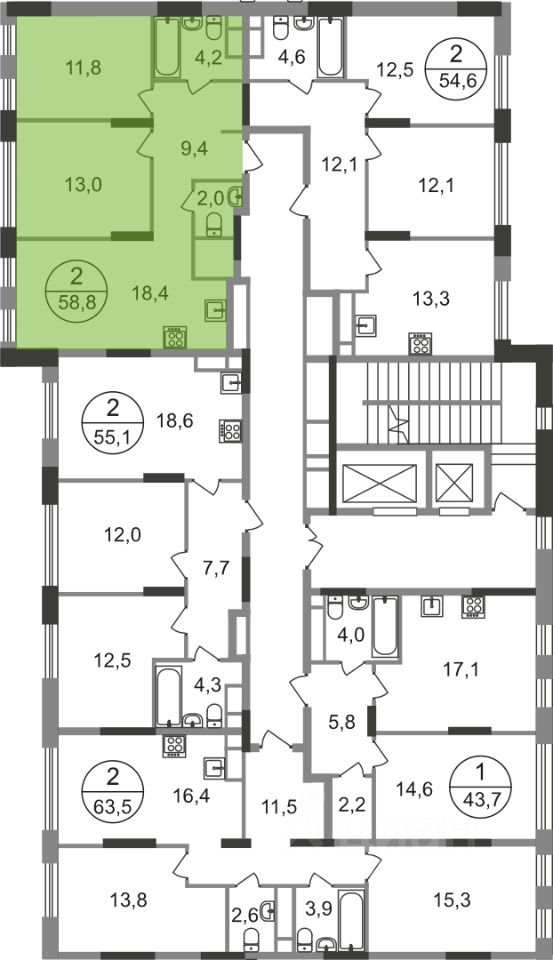 Общая площадь квартиры - 58,8 кв. м, этаж 6 из 17.