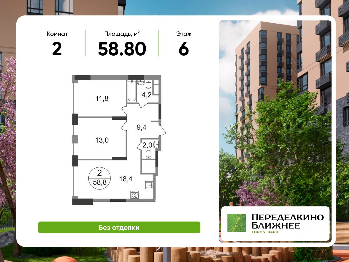 Продается двухкомнатная квартира без отделки в городе-парке "Переделкино Ближнее".