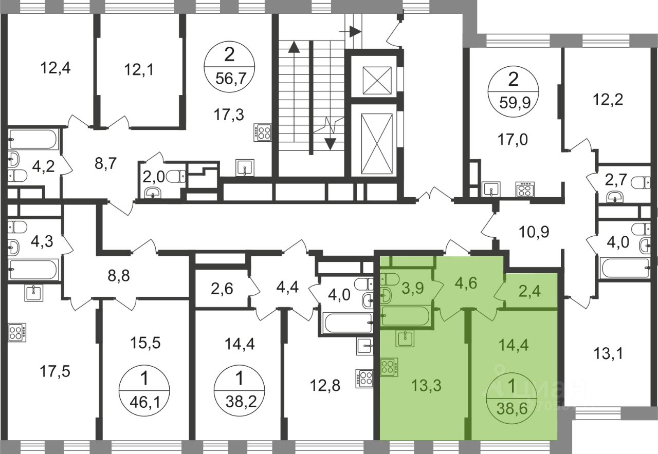 Общая площадь квартиры - 38,6 кв. м, этаж 3 из 17.