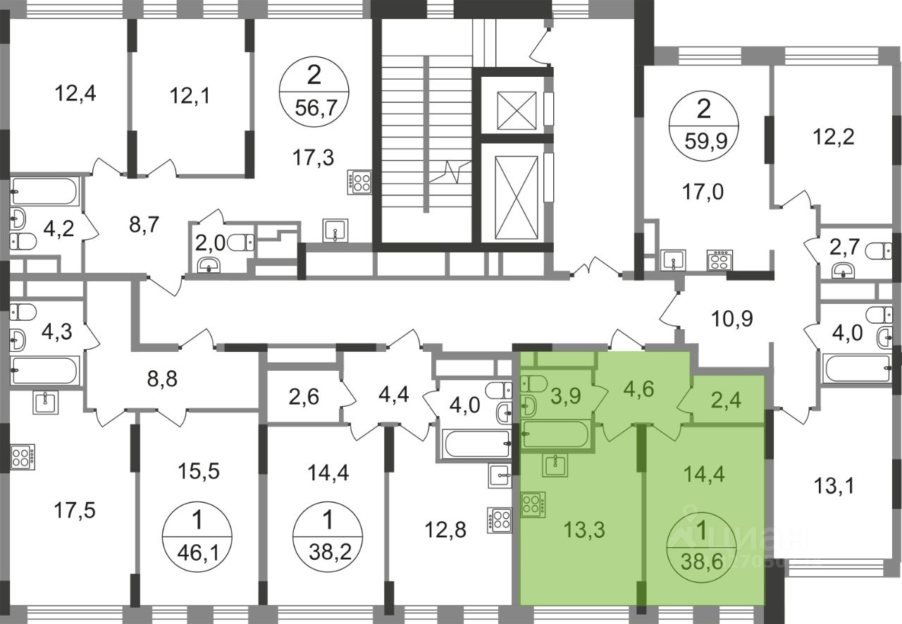 Общая площадь квартиры - 38,6 кв. м, этаж 10 из 17.