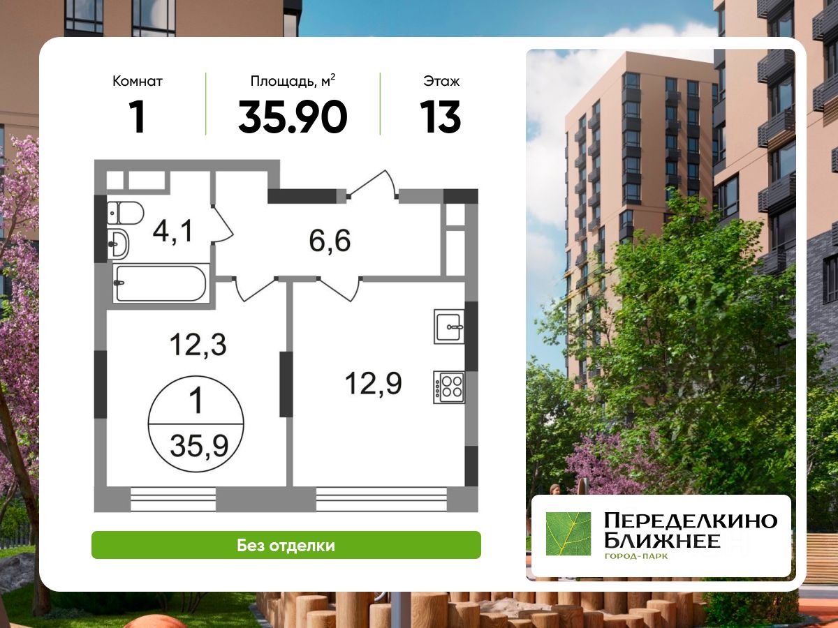 Продается однокомнатная квартира без отделки в городе-парке "Переделкино Ближнее".