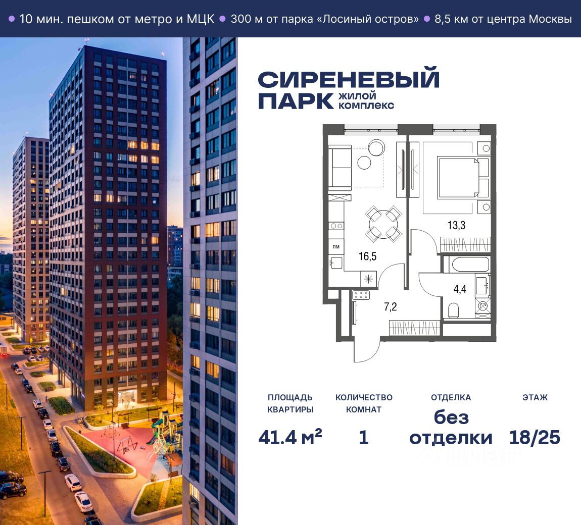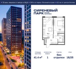 Продаётся просторная 1-комнатная квартира общей площадью 41.4 м² на 18 этаже в новом жилом комплексе "Сиреневый парк", расположенном в Восточном административном округе Москвы на улице Тагильская. Всего 10 минут ходьбы от станции метро "Бульвар Рокоссовского" и одноимённой платформы МЦК.