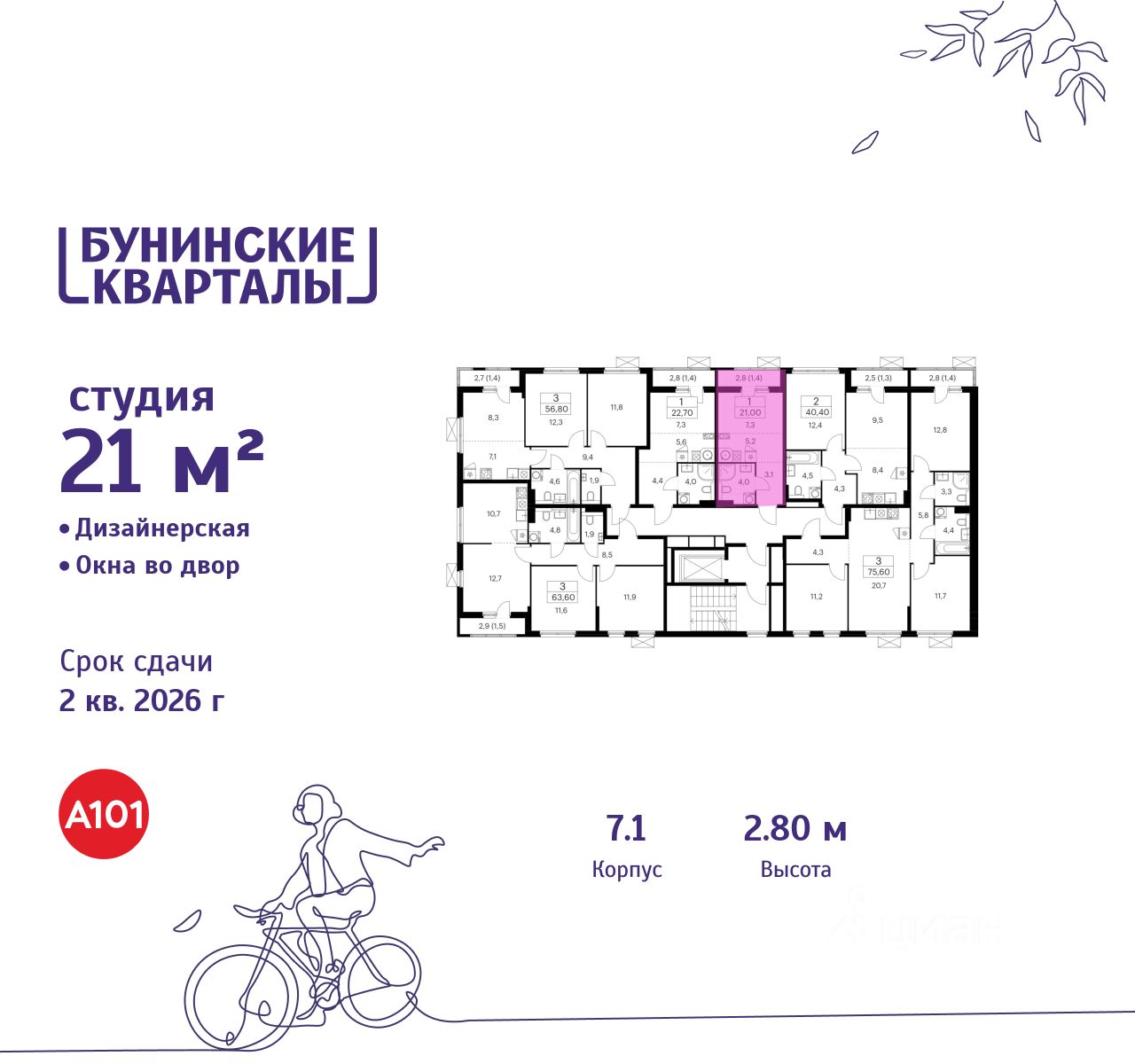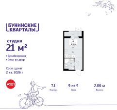 Продается студия 46 в новостройке ЖК "Бунинские кварталы" по адресу Москва, ТиНАО, Новомосковский АО, Сосенское С/П, жилой комплекс Бунинские Кварталы, 7.1, район Коммунарка, Новомосковский административный округ, Москва. Общая площадь квартиры - 21.00 кв. м., этаж 9 из 9, секция 1. Тип проекта, по которому построен дом - монолит, компания-застройщик - ООО "А101". Стоимость квартиры - 11558190 Р.