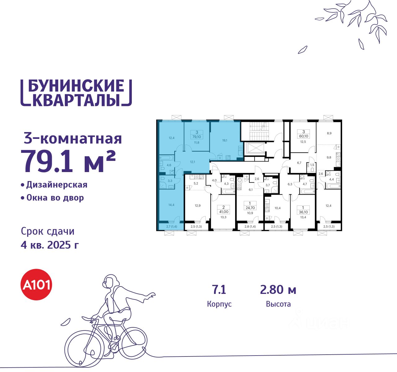 Продается трехкомнатная квартира 379 в новостройке ЖК "Бунинские кварталы" по адресу Москва, ТиНАО, Новомосковский АО, Сосенское С/П, жилой комплекс Бунинские Кварталы, 7.1, район Коммунарка, Новомосковский административный округ, Москва. Общая площадь квартиры - 79.10 кв. м., этаж 8 из 9, секция 6. Тип проекта, по которому построен дом - монолит, компания-застройщик - ООО "А101". Стоимость квартиры - 27416851 Р.