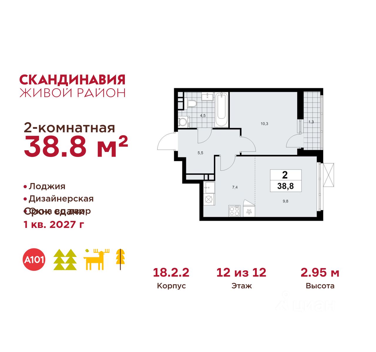 Продается двухкомнатная квартира 270 в новостройке Жилой район "Скандинавия" по адресу Москва, ТиНАО, Новомосковский АО, Сосенское С/П, Коммунарка пос., Москва, Новомосковский административный округ, район Коммунарка, ЖК Скандинавия, 18.2.2. Общая площадь квартиры - 38.80 кв. м., этаж 12 из 12, секция 4. Тип проекта, по которому построен дом - монолит, компания-застройщик - ООО "А101". Стоимость квартиры - 18455996 Р. Срок сдачи - 1 квартал 2027.