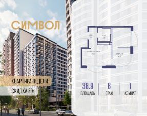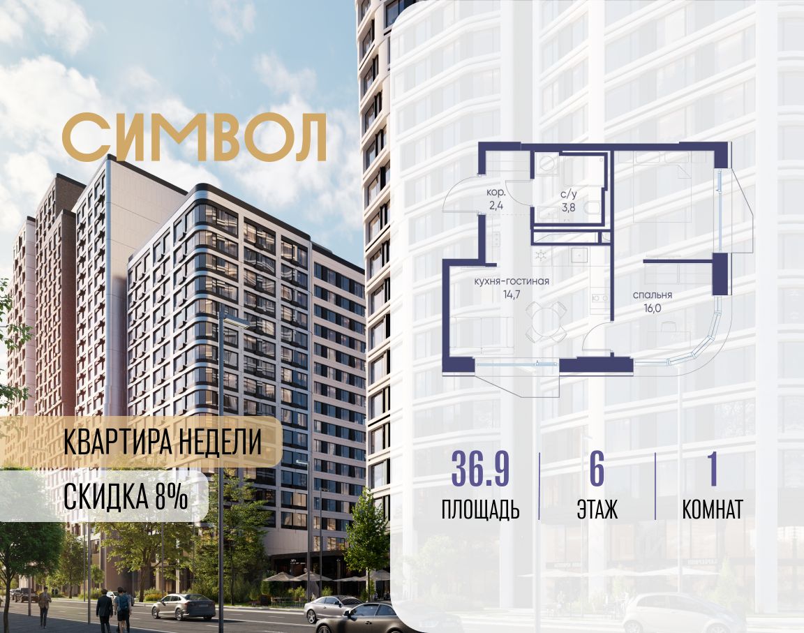 Продается 1-комнатная квартира от застройщика: общая площадь 36.90 м², жилая 16.00 м², кухня 14.70 м², 6-й этаж, жилой квартал "Гордость", корпус 40 (секция 1). Срок сдачи: 2 квартал 2029 года.