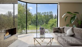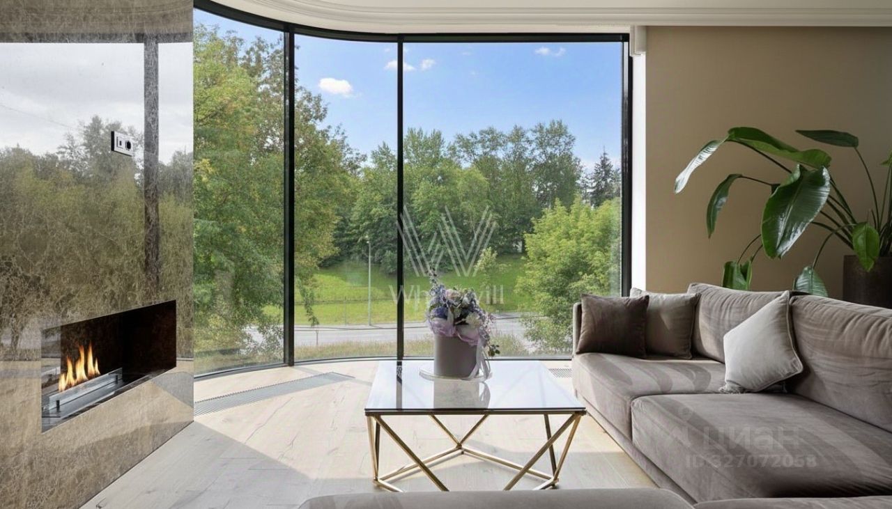 В прихожей, санузлах и на кухне установлена система теплый пол. Высота потолков — 3 метра. Функциональная планировка включает кухню-гостиную с камином, две спальни, два санузла, гардеробную и холл. Благодаря панорамному остеклению пространство наполнено естественным светом, открываются виды на природный заказник "Долина реки Сетунь" и Воробьевское шоссе.