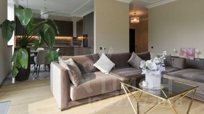 Просторная квартира с двумя спальнями в комплексе премиум-класса "Воробьев дом" в районе Раменки. Квартира общей площадью 99 м² расположена на 2-м этаже. Выполнена авторская отделка в современном стиле, на полу уложены паркетная доска из массива дуба от шведской компании Kahrs и плитка. Итальянская кухня Cesar с мраморной столешницей оборудована бытовой техникой Kuppersbusch и Miele. Сантехника представлена брендом GD Porcelanosa.