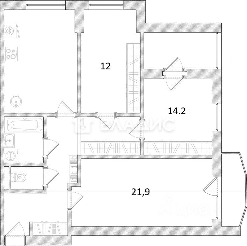 Квартира расположена на 9 таже из 14-ти. Две комнаты (22 м² и 15 м²) сориентированы на северо-восток, одна комната на север. Лоджия (в комнате 15 м²) утеплена и может использоваться под кабинет, так же имеется застеклённый балкон (в комнате 22 м²). Кухня оборудованная мебелью и техникой 15 м². По всей квартире хороший паркет, можно отциклевать. Встроенные шкафы так же в квартире. Высота потолков 2.8 м.