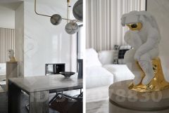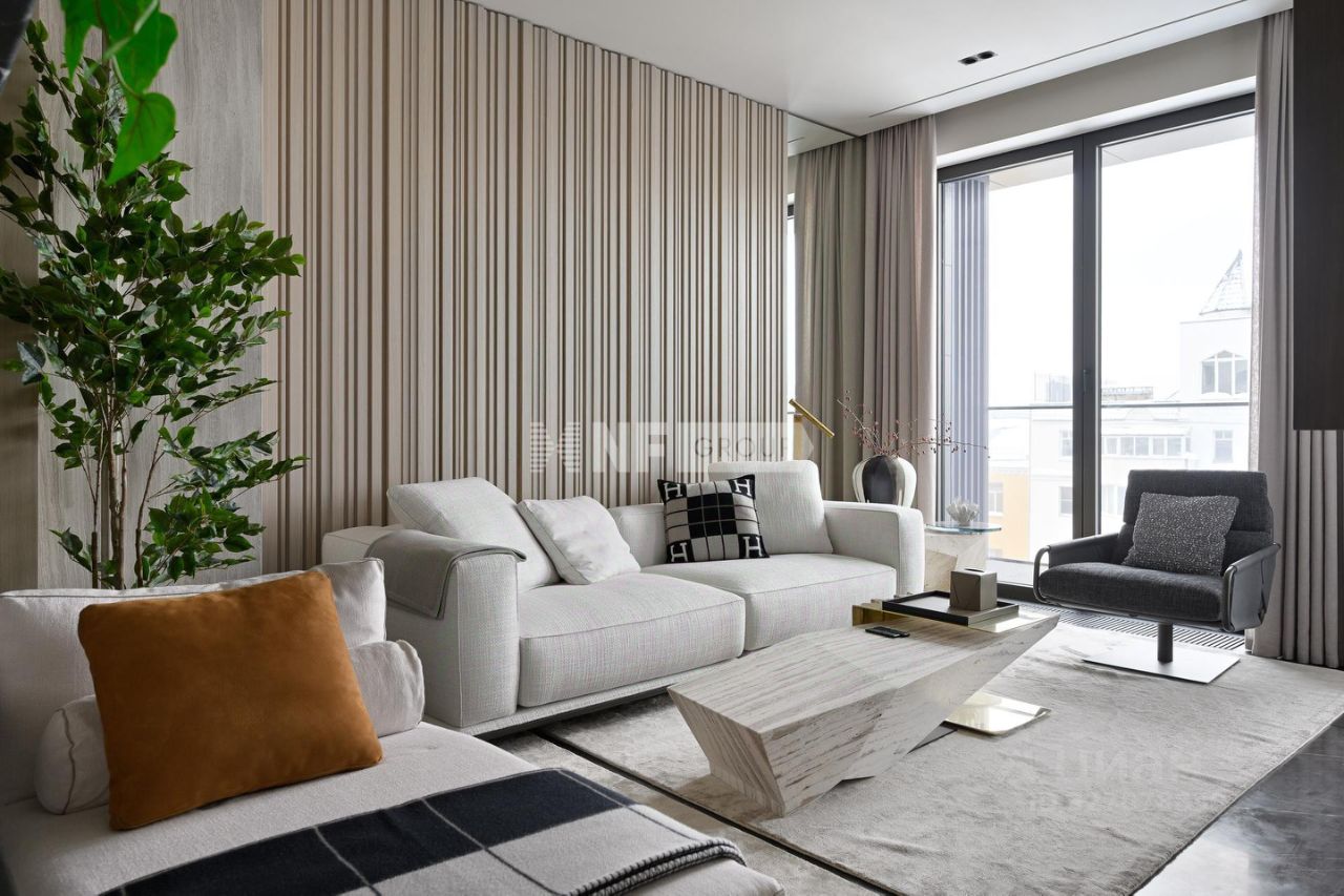 Пентхаус полностью меблирован — обстановка выдержана в концепции спокойной современной роскоши с использованием мировых брендов (Baxter, Minotti, Poliform, Poltrona Frau и пр.)