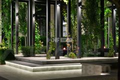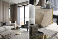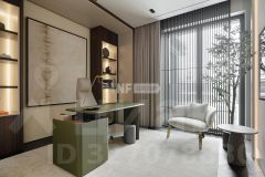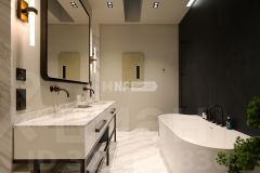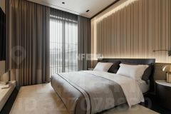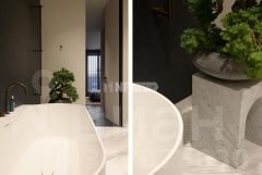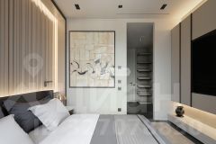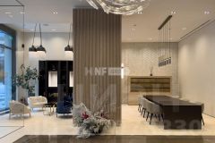 Отделка выполнена по дизайнерскому проекту с использованием натурального камня, декоративных деревянных панелей и современной светотехники; интегрированы премиальные материалы, встроенные решения хранения и архитектурный свет.