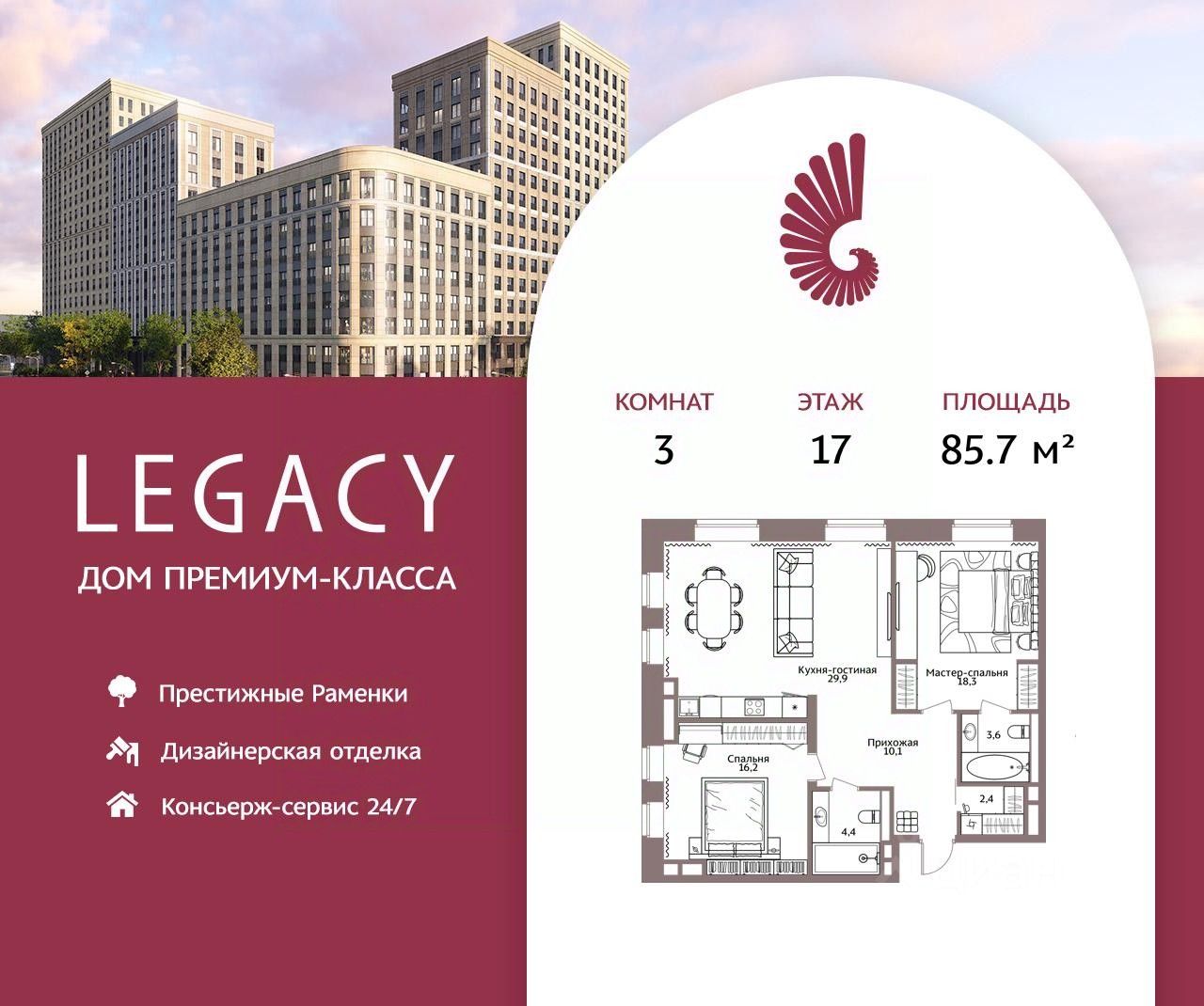 Светлая квартира общей площадью 83 м2 на 4-м этаже премиального жилого комплекса Legacy, расположенного в прекрасном зеленом районе Раменки.