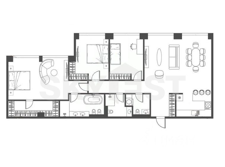 Планировка: кухня-гостиная, мастер-спальня с собственной гардеробной и ванной комнатой, 2 спальни, гардеробная, 2 санузла.