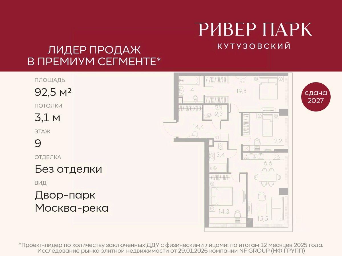 Продается 3-к квартира площадью 92.5 кв.м. на 9-м этаже в жилом комплексе премиум-класса Ривер Парк Кутузовский в Башне Лазурь