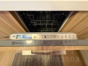 - Зона кухни: встроенная техника (плита, духовой шкаф, посудомоечная машина Electrolux, холодильник). Для экономии пространства обеденная зона оснащена барной стойкой с дополнительными шкафами для хранения посуды.