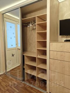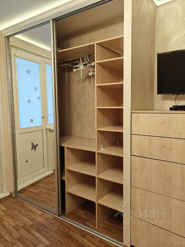 Вместительный встроенный шкаф в комнате с большими зеркальными дверями.