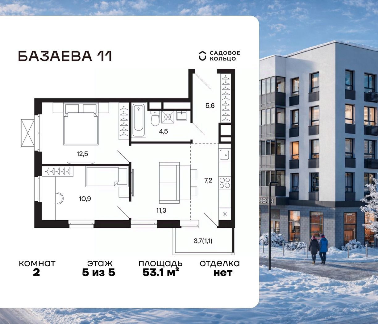 Продается квартира в ЖК "Базаева, 11" с 2 спальнями на 5 этаже 5 этажного дома. Общая площадь: 53.1 кв.м. Высота потолков 2.72 м. Срок сдачи 2 квартал 2027 г. Эскроу-счет. Застройщик ГК "Садовое кольцо".