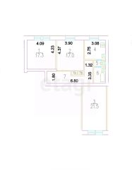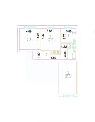 ПЛАНИРОВКА состоит из 3х больших изолированных жилых комнат по 17 кв.м., кухни 8,5 кв.м., раздельного санузла, гардеробной и просторного холла с местами хранения.