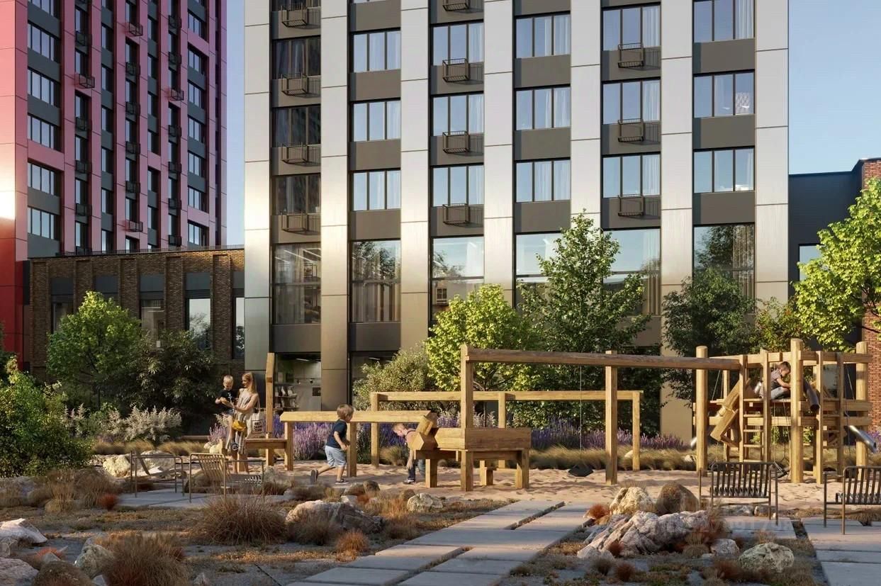 На первых этажах жилого комплекса откроются магазины, салоны красоты, фитнес-центр. Для детей строятся собственные детский сад и школа.