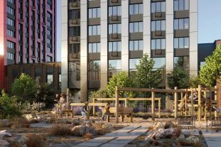 Вся площадь двора-парка будет огорожена и составит более 2 га, из которых 45% - озеленение. Одним из самых важных ландшафтных элементов здесь станет небольшая речка, наполняющаяся во время дождя. Вокруг неё появится сеть из островов, внутри которых расположатся тематические зоны спорта и отдыха.