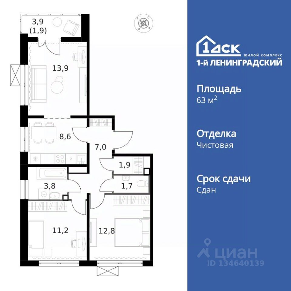 Продаётся 3-к квартира номер 46 общей площадью 63.2 кв.м. на 7-м этаже 14 этажного здания. Чистовая отделка. Цена с учётом скидки.